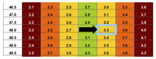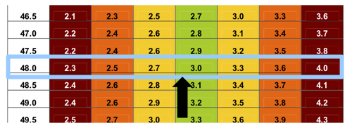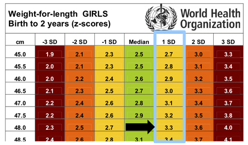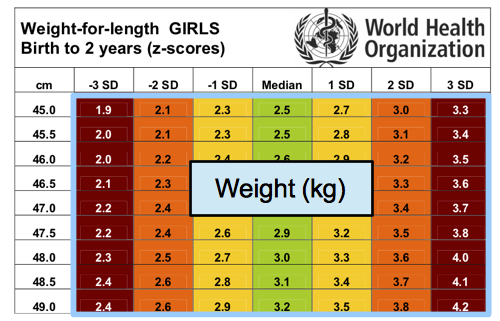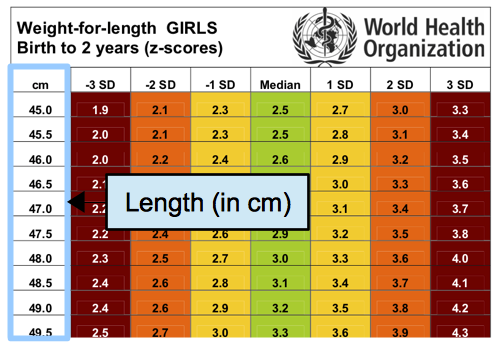Once you have found the girl’s length in the left-most column, you now have to look for the girl’s weight in the body of the table. Specifically, you should look for the girl’s weight along the row corresponding to her length.
