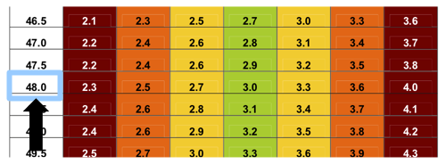 Find the length of the child on the reference table. In the left-most column of the reference table you will find the values for the length in centimetres. So for this child, you should look for 48.0 cm length in the left-most column.